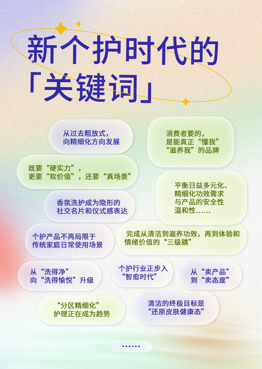 个人护理市场需求出现显著迭代:已完成从清洁到滋养功效,再到体验和情绪价值的“三级跳”。今天的消费者,早已不满足于产品基础使用功能了。简单说,是“既要又要还要”: