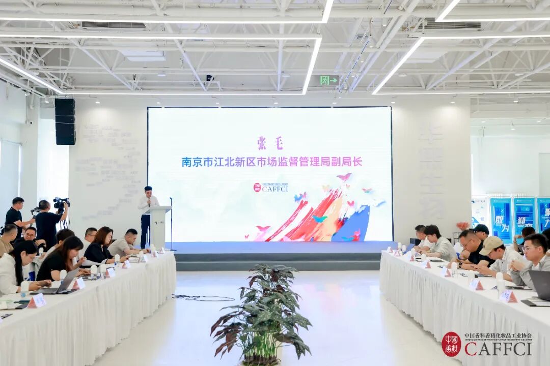 中国香妆协会理事长、医学博士颜江瑛,南京江北新区党工委委员、管委会副主任陶磊,国药励展展览有限责任公司副总经理刘岩出席会议并致辞。南京市江北新区市场监督管理局副局长张毛,南京市江北新区市场监管局食药办主任孙璐,中国香妆协会顾问董树芬等相关领导、嘉宾与媒体代表等共同出席了本次会议。会议由中国香妆协会会展部主任胡晟主持。