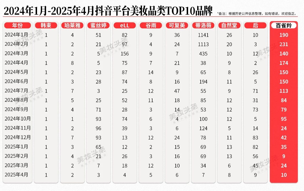 百雀羚登顶抖音美妆护肤品牌榜,成为今年双11战线中首个重大变化。
