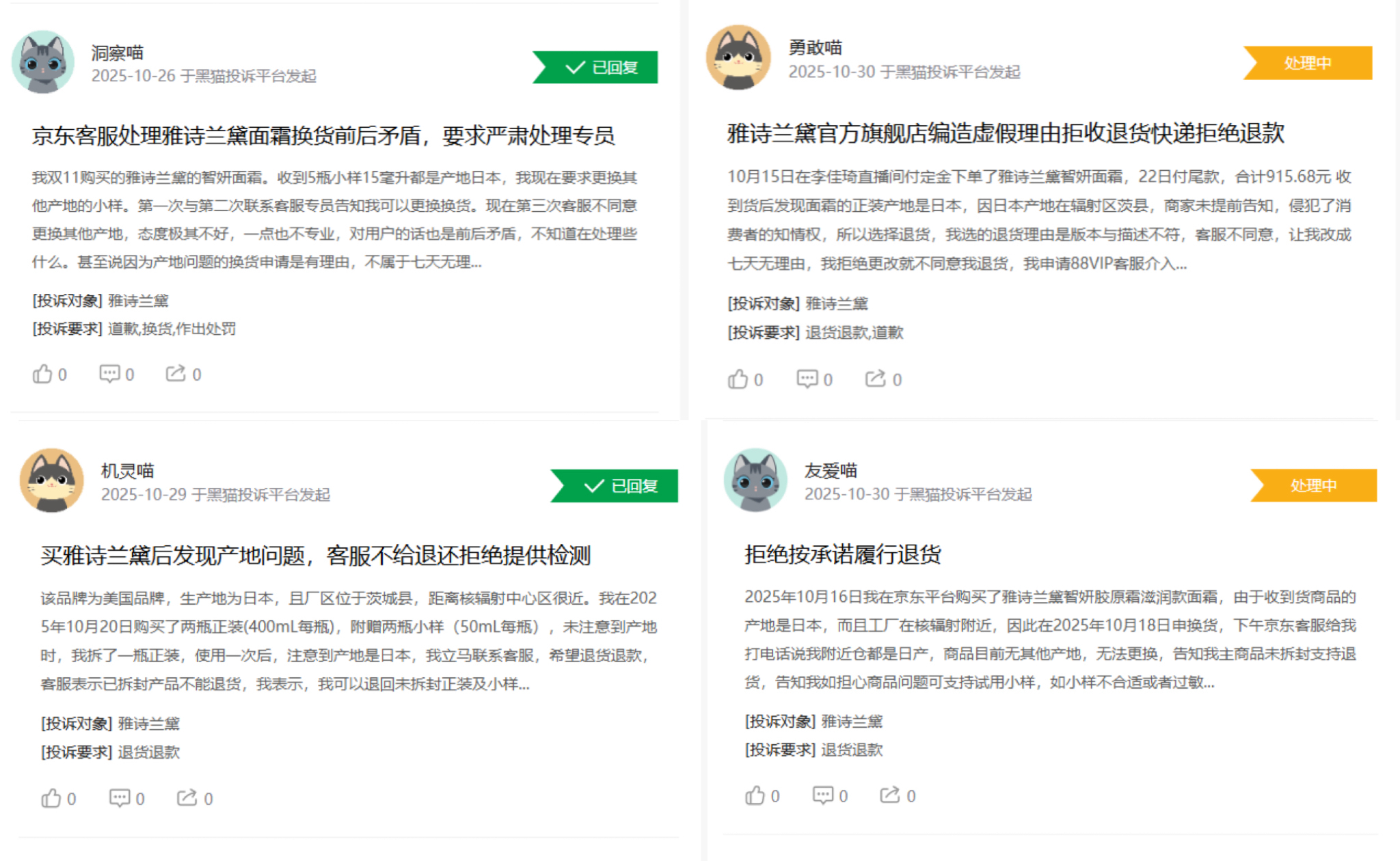 在黑猫投诉平台,雅诗兰黛的投诉单中,也有不少涉及到品牌产品原产地为核辐射附近的投诉,认为商家未提前告知,侵犯了消费者的知情权。