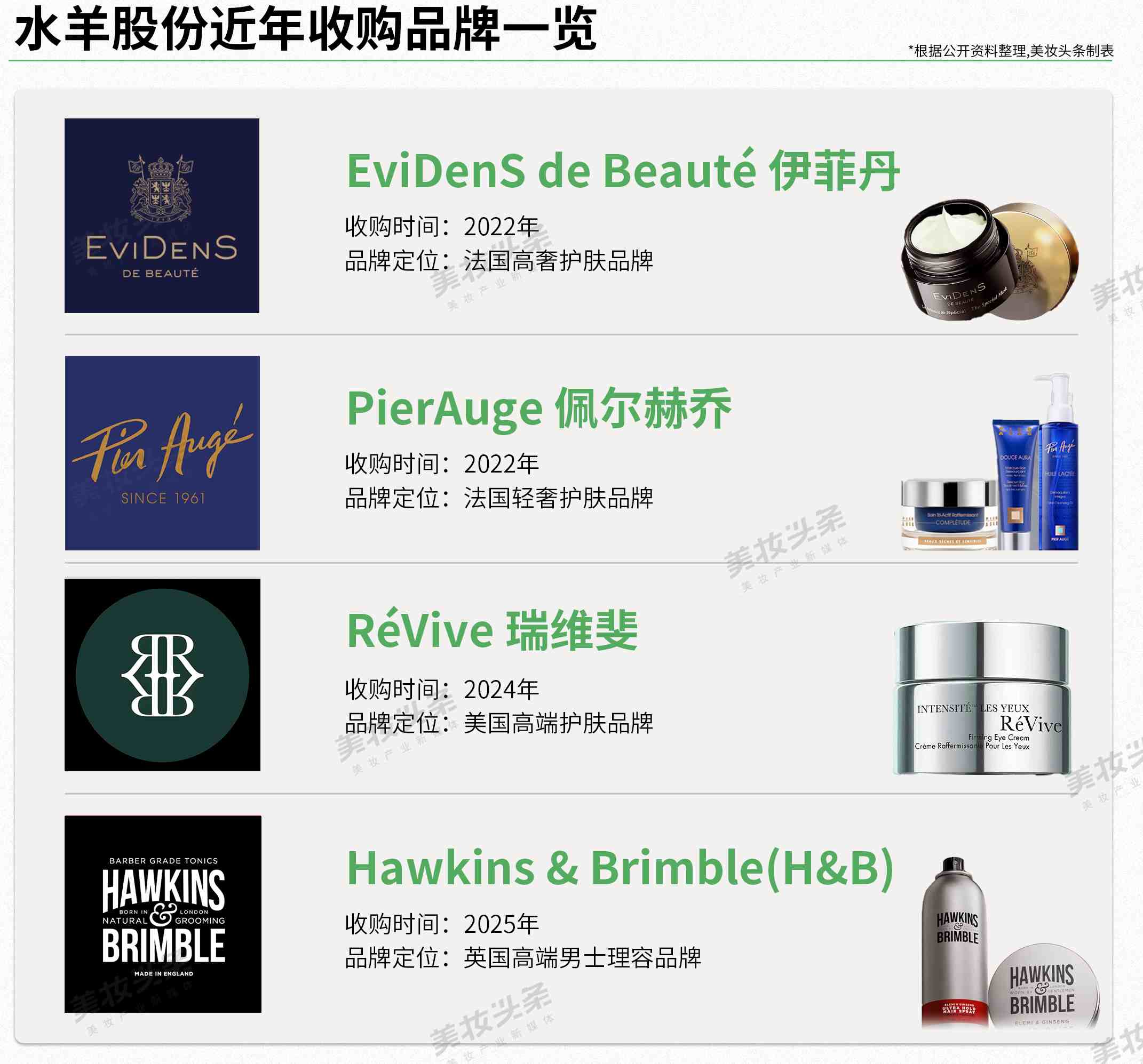 2022年,水羊股份斥资超3亿元收购法国高奢护肤品牌伊菲丹(EDB),同年还取得了法国轻奢院线修护品牌PierAuge(佩尔赫乔,PA)的中国商标,并于2024年获得法国PA的完整所有权。去年10月,水羊股份宣布完成对美国奢华科学功效护肤品牌RéVive(RV)的收购。
