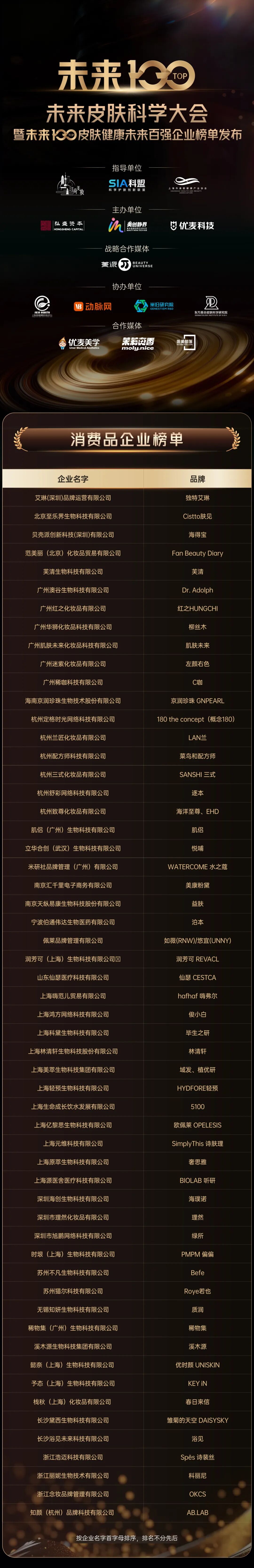 “未来100·皮肤健康未来百强企业榜单”的发布是当天的重点环节。这份聚焦行业腰部力量的榜单,从消费品、医学美容科技、生物科技三大板块中筛选出最具成长潜力的企业。