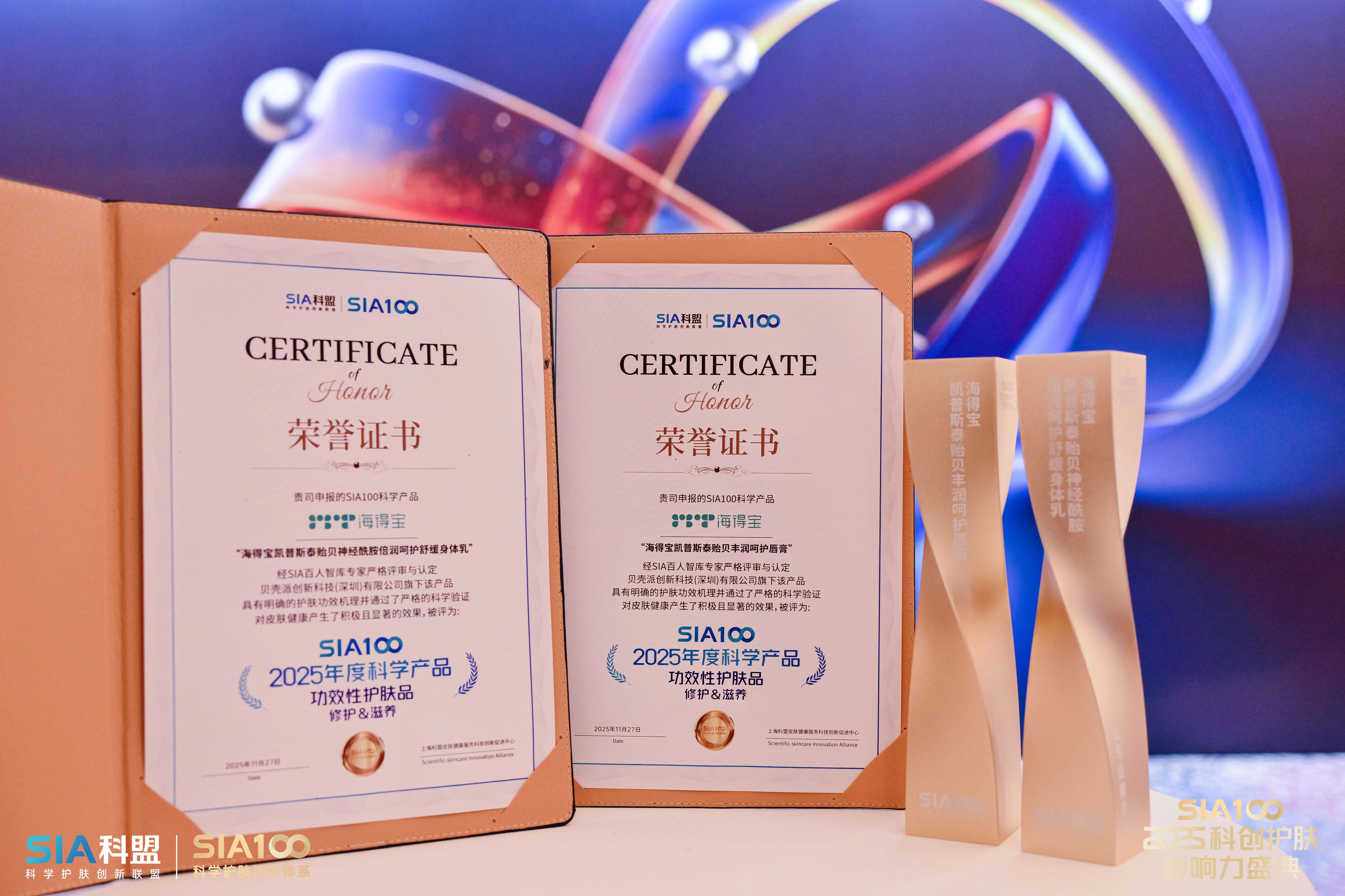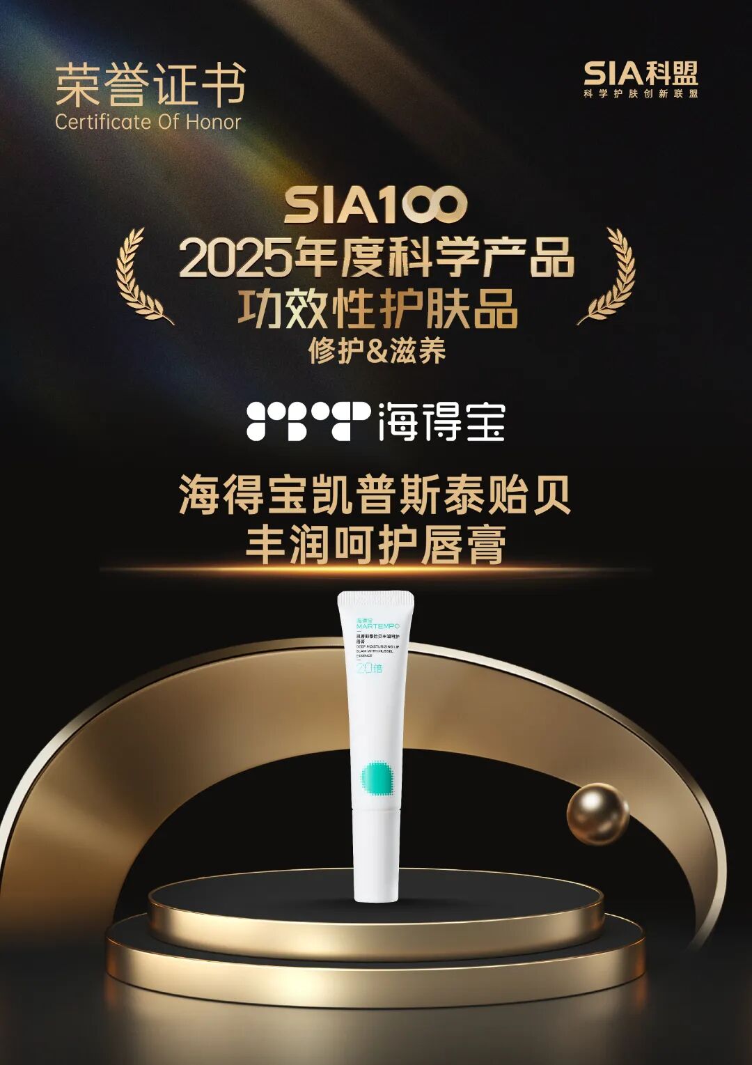 刚刚落幕的SIA2025科学护肤创新联盟年度大会上,海得宝MARTEMPO旗下核心产品——海得宝MARTEMPO凯普斯泰贻贝神经酰胺倍润呵护舒缓身体乳(简称:5X大白管特护霜)与海得宝MARTEMPO凯普斯泰贻贝丰润呵护唇膏(简称:20X唇敏修护唇膏),成功入选权威的“SIA100科创护肤影响力盛典”,并荣获“科学产品-功效性护肤品”奖项。