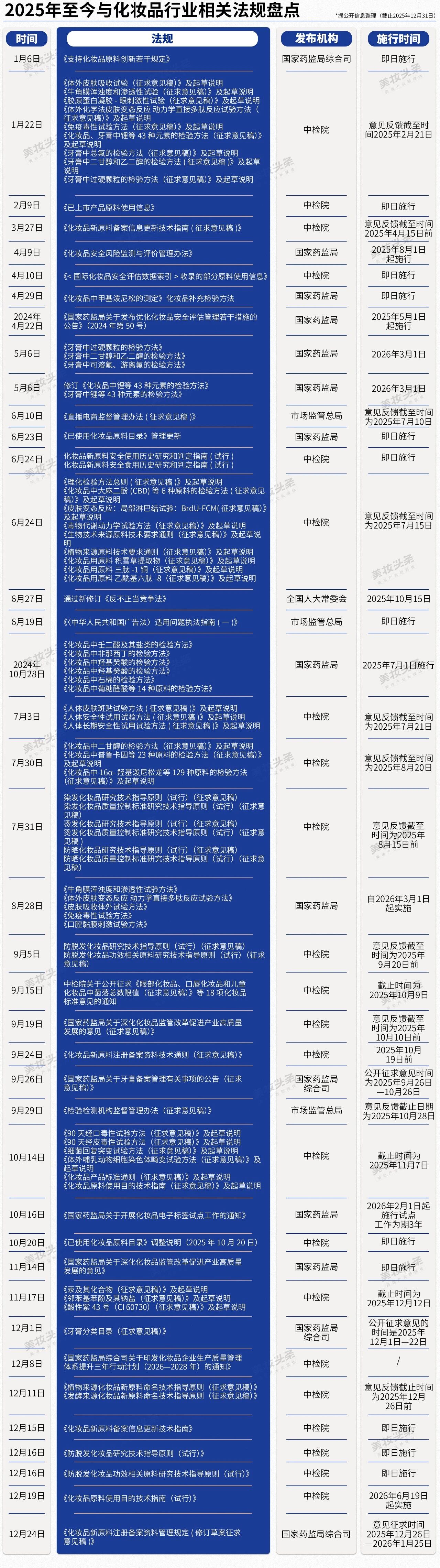从原料、成分、技术、检验方法的丰富完善,到产品功效宣称、营销红线的划定,再到传统品类“退场”倒计时,多维度法规监管趋严,无不在昭示着一个更为规范的美妆市场秩序正在加速形成。