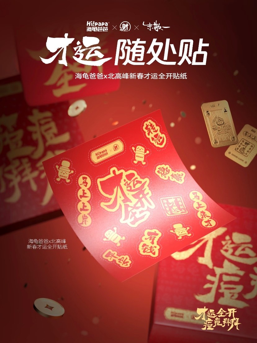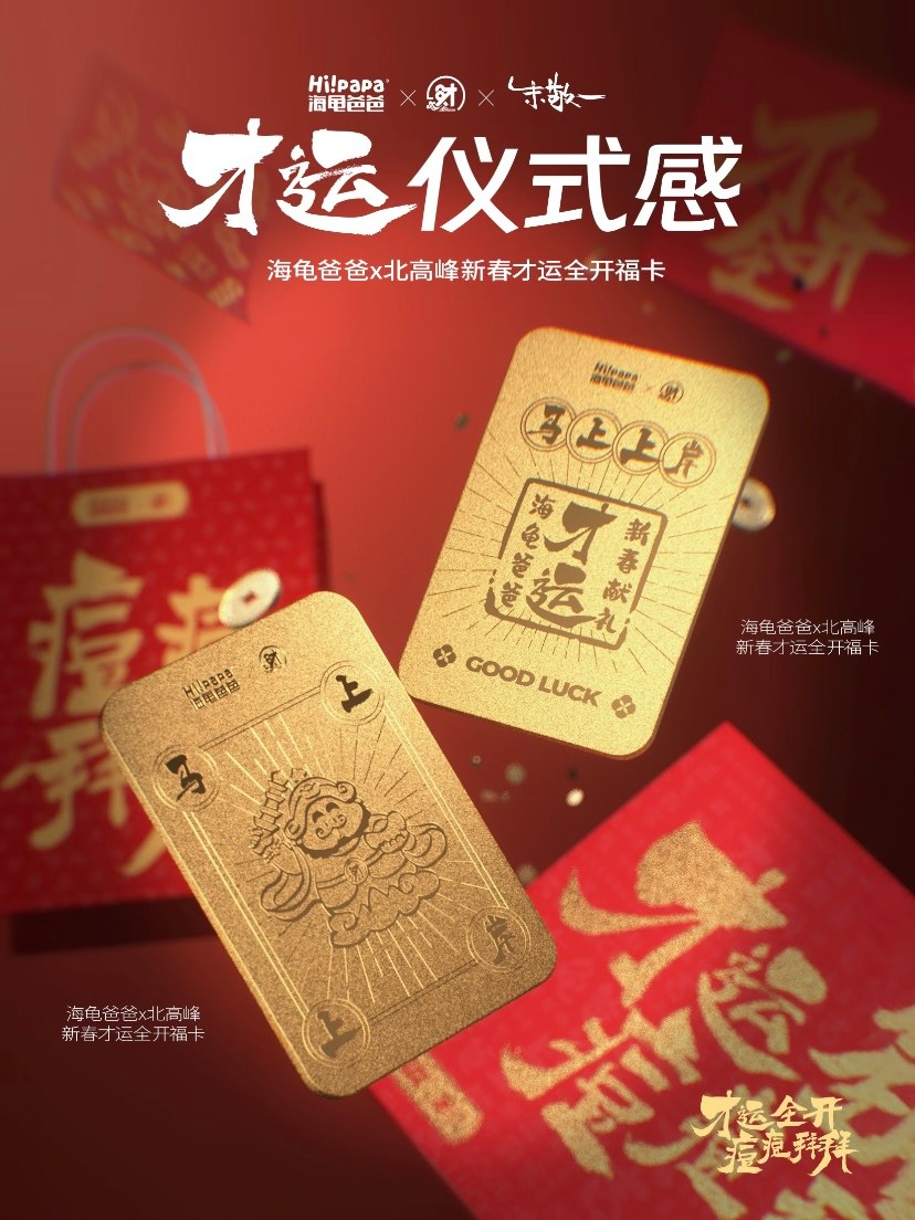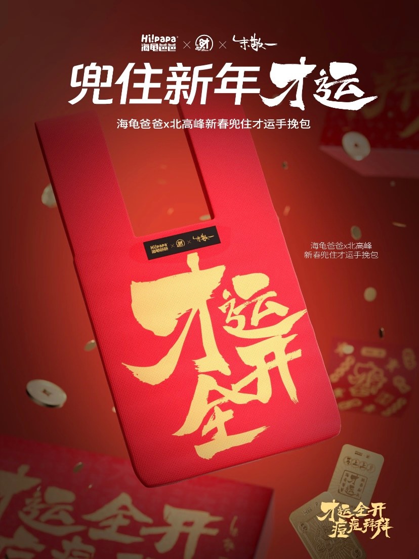 更值得称道的是,海龟爸爸将产品使用过程也进行了仪式化设计。全新烫金工艺加乘新春高级红配色搭配活动各式联名周边,首先在开箱瞬间创造了强烈的仪式感和惊喜感。特色国潮联名北高峰周边(如“才运全开符”、手腕包)则让产品使用成为一种可分享的社交行为。