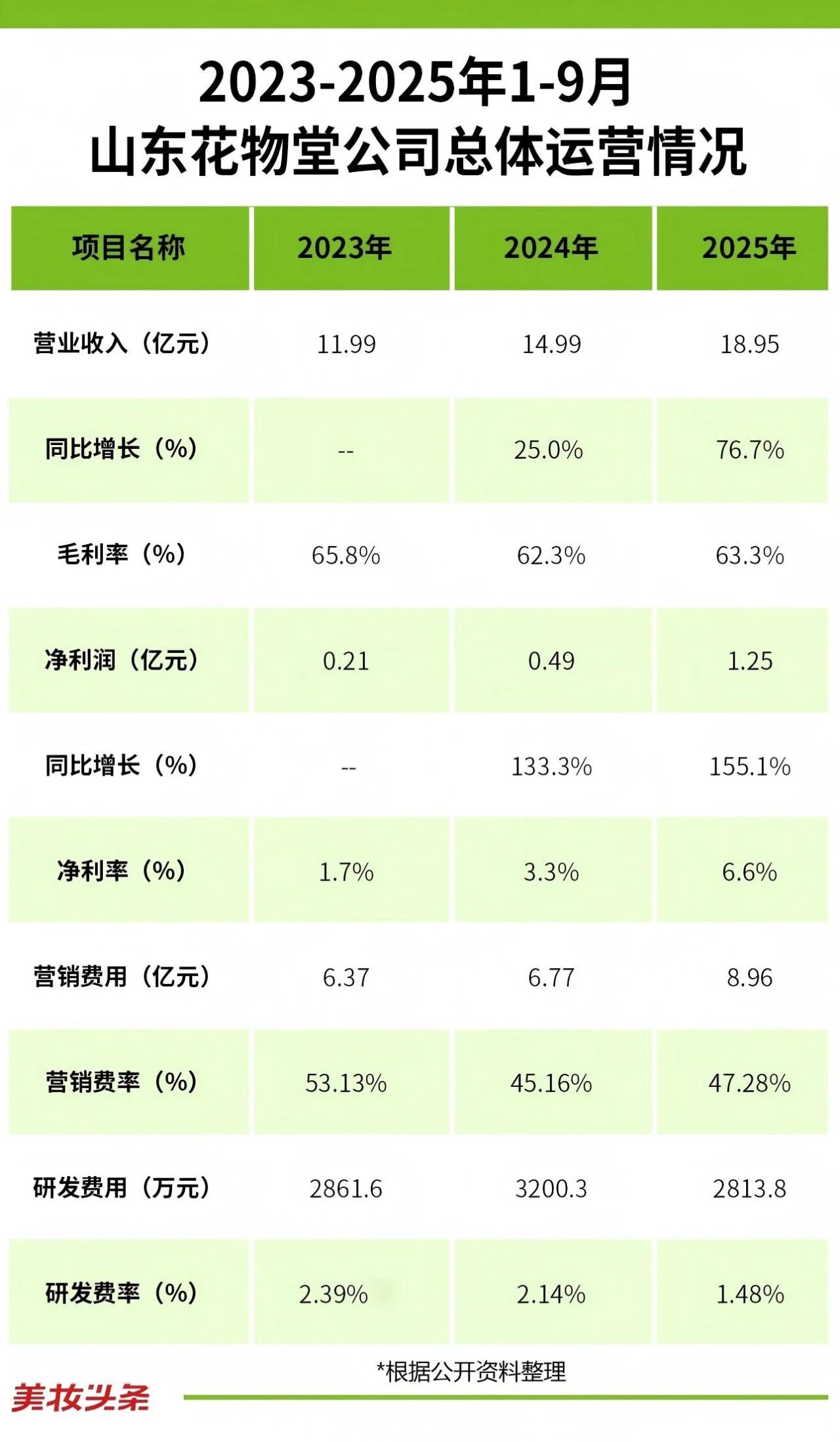 营收:2010年创立的半亩花田近年实现“火箭式”跃进——2023年营收11.99亿元,2024年增至14.99亿元,2025年前9个月飙升至18.95亿元,同比增速76.7%(详见下表)。按此趋势,其2025年全年营收突破20亿元已成定局。
