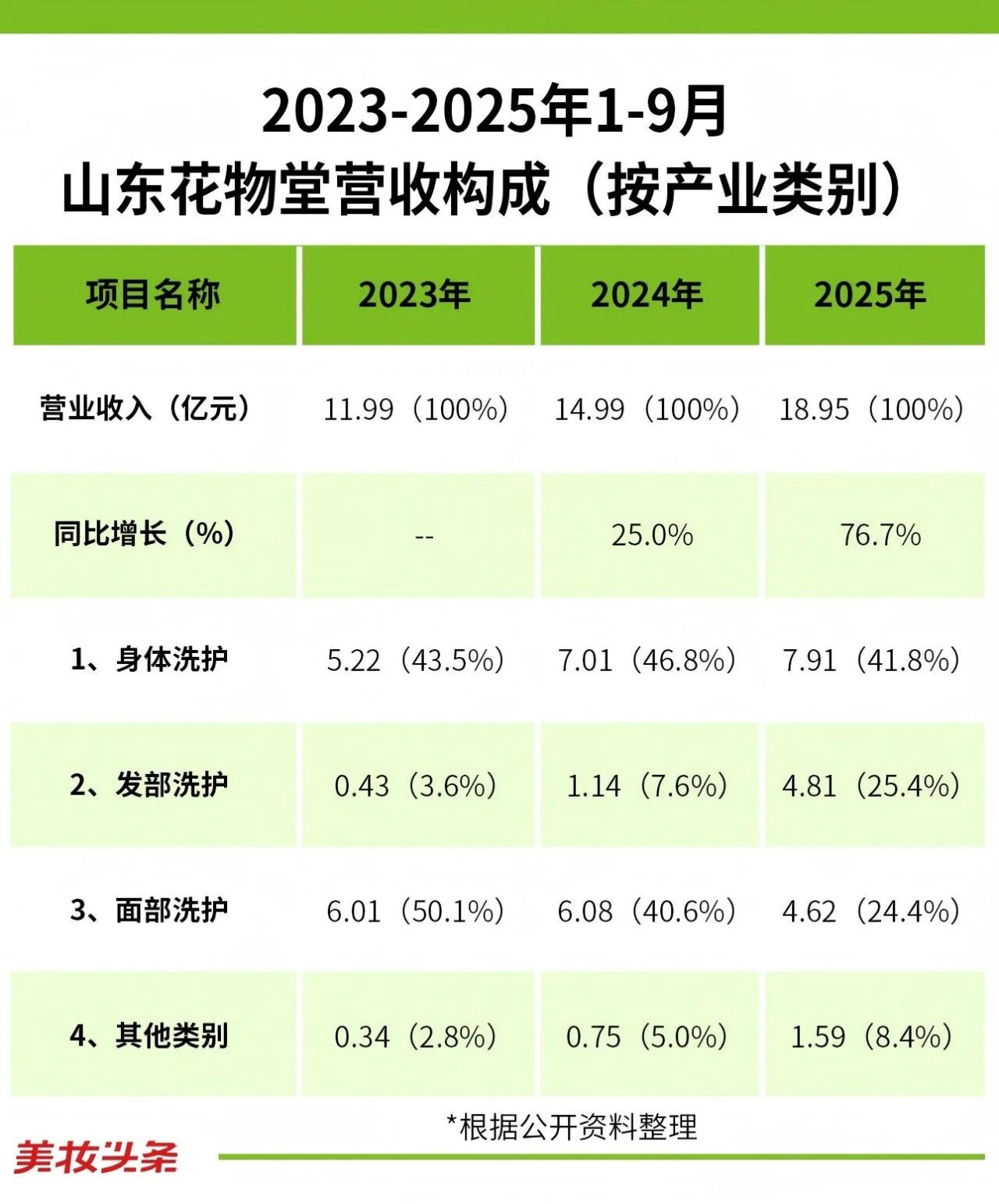 这是半亩花田“第二增长曲线”,其增长故事中最具爆发力的部分。该品类营收从2023年的0.43亿元(占比3.6%),飙升至2025年前9个月的4.81亿元(占比25.4%),期内同比增长496.1%。按照当前强劲的增长势头,预计2025年半亩花田发部洗护业务营收将突破6.5亿元,这一成绩不仅远超行业平均增速,更在短短几年内实现了对众多传统洗发护发品牌十余年发展成果的超越。