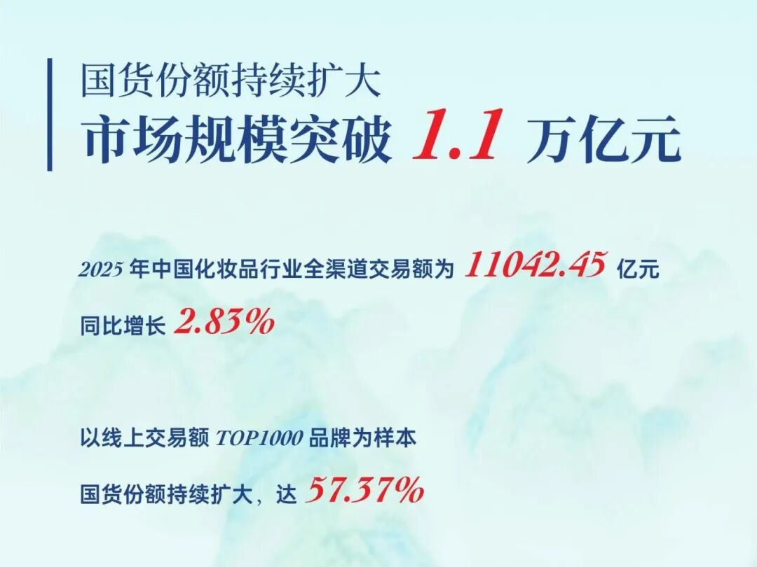 “2025年中国化妆品行业全渠道交易额达11042.45亿元,市场规模首次突破1.1万亿元,同比增长2.83%,连续多年稳居全球第一大化妆品消费市场。”