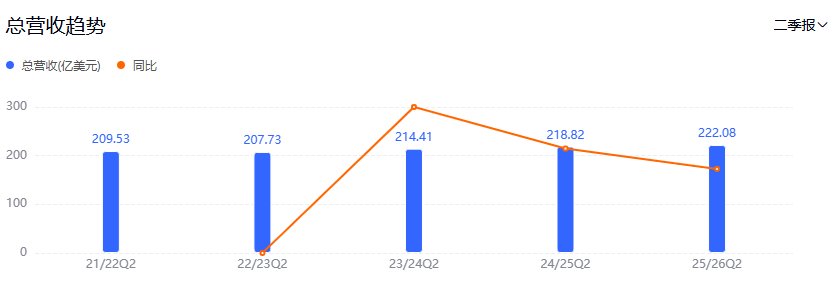 对比发现,宝洁2026财年第二季度222亿美元的净销售额为近五年最高值。其中,2022财年第二季度净销售额为209.5亿美元、2023财年第二季度净销售额为207.7亿美元、2024财年第二季度净销售额为214.4亿美元、2025财年第二季度净销售额为218.8亿美元。