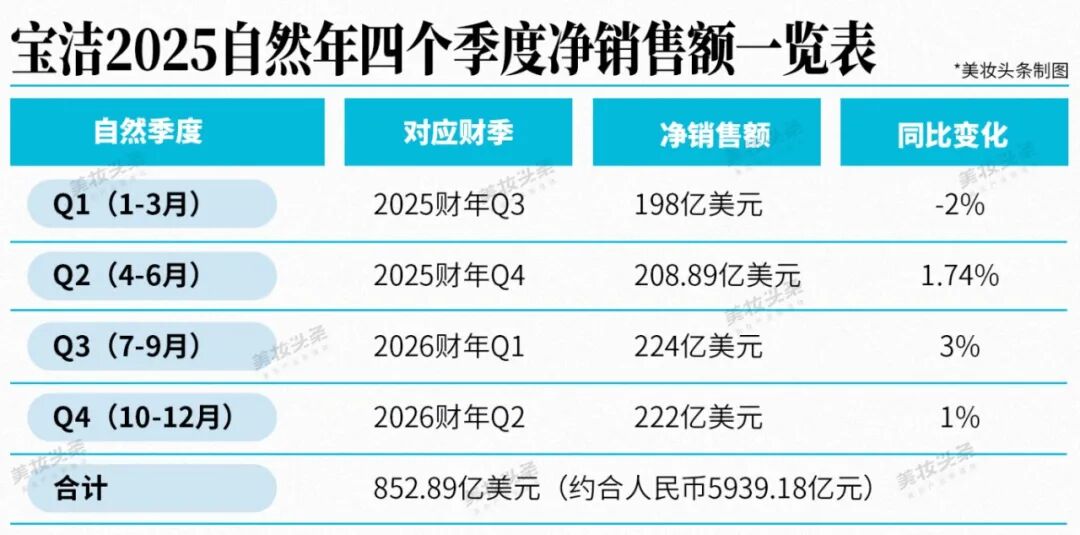 《美妆头条》根据此前发布的财报统计,2025年自然年,宝洁净销售额约为852.89亿美元(约合人民币5939.18 亿元)。