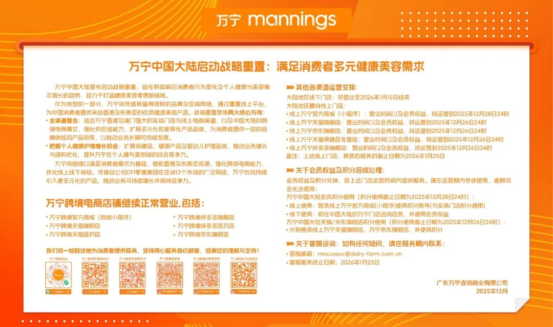 年中,莎莎国际宣布关闭内地所有剩余门店,结束长达20年的实体零售业务,后续专注线上渠道;年末,DFI零售集团旗下大连锁品牌万宁,同样宣布停止运营中国内地所有线下门店。
