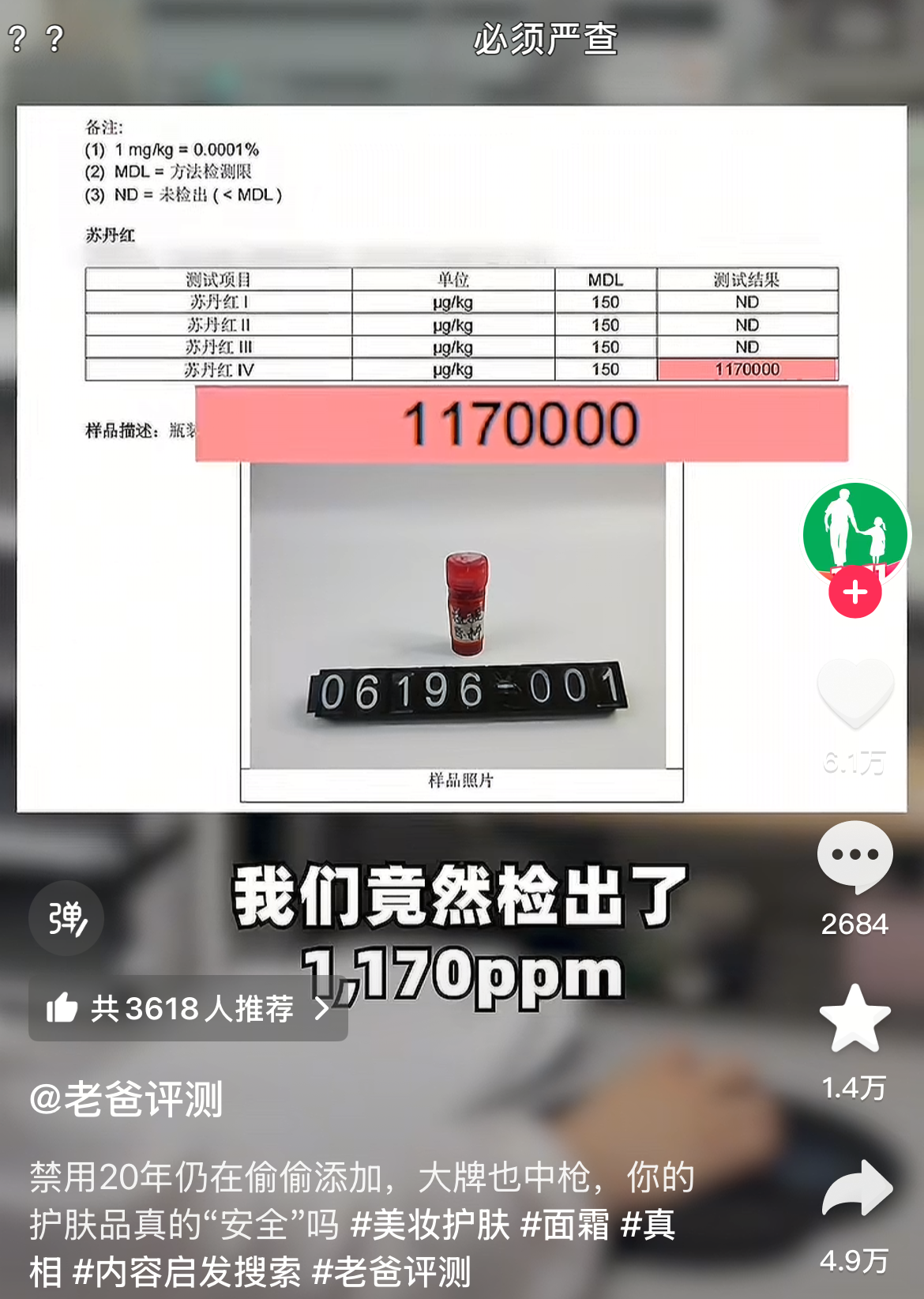 10月,知名测评博主“老爸评测”曝光在多款护肤品中检出禁用成分苏丹红,同样引发行业“大地震”。通过溯源排查,“老爸评测”在一款原料商所提供的红色复合植物原料组中测出苏丹红。