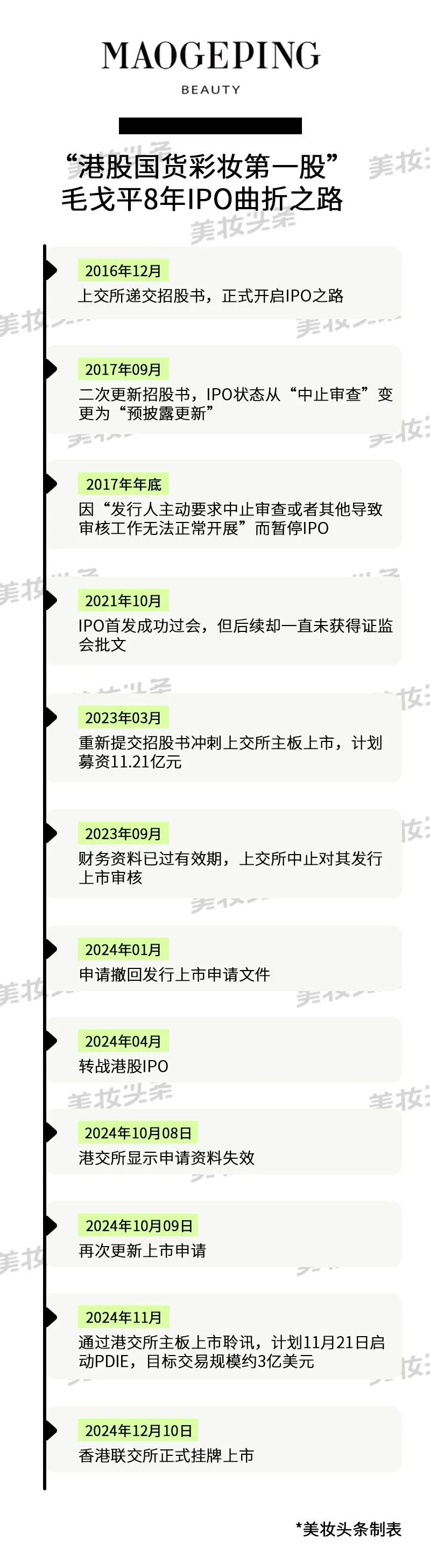 而毛戈平则在A股走了7年“弯路”之后始终未能如愿上市,2024年4月转战港交所后,便在当年顺利上市。