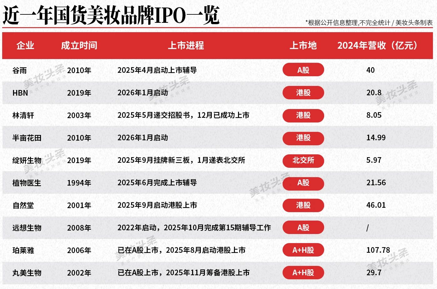 从2025年启动A股辅导的“国产美白第一股”谷雨,到同年成功登陆港股的“国货高端护肤第一股”林清轩,再到2026年初接连递表的半亩花田与HBN,以及早已是A股美妆巨头又筹划港股二次上市的珀莱雅、丸美,本土美妆品牌的资本化进程明显提速。