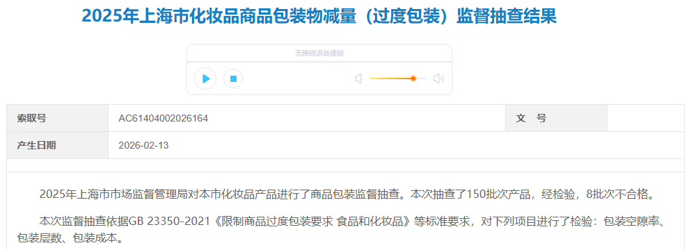 近期,上海市市场监督管理局发布《2025 年上海市化妆品商品包装物减量(过度包装)监督抽查结果》。在抽查的150批次产品中,多批次产品因包装问题不合格,涉及国际品牌、本土老牌以及近年势头强劲的新锐品牌。