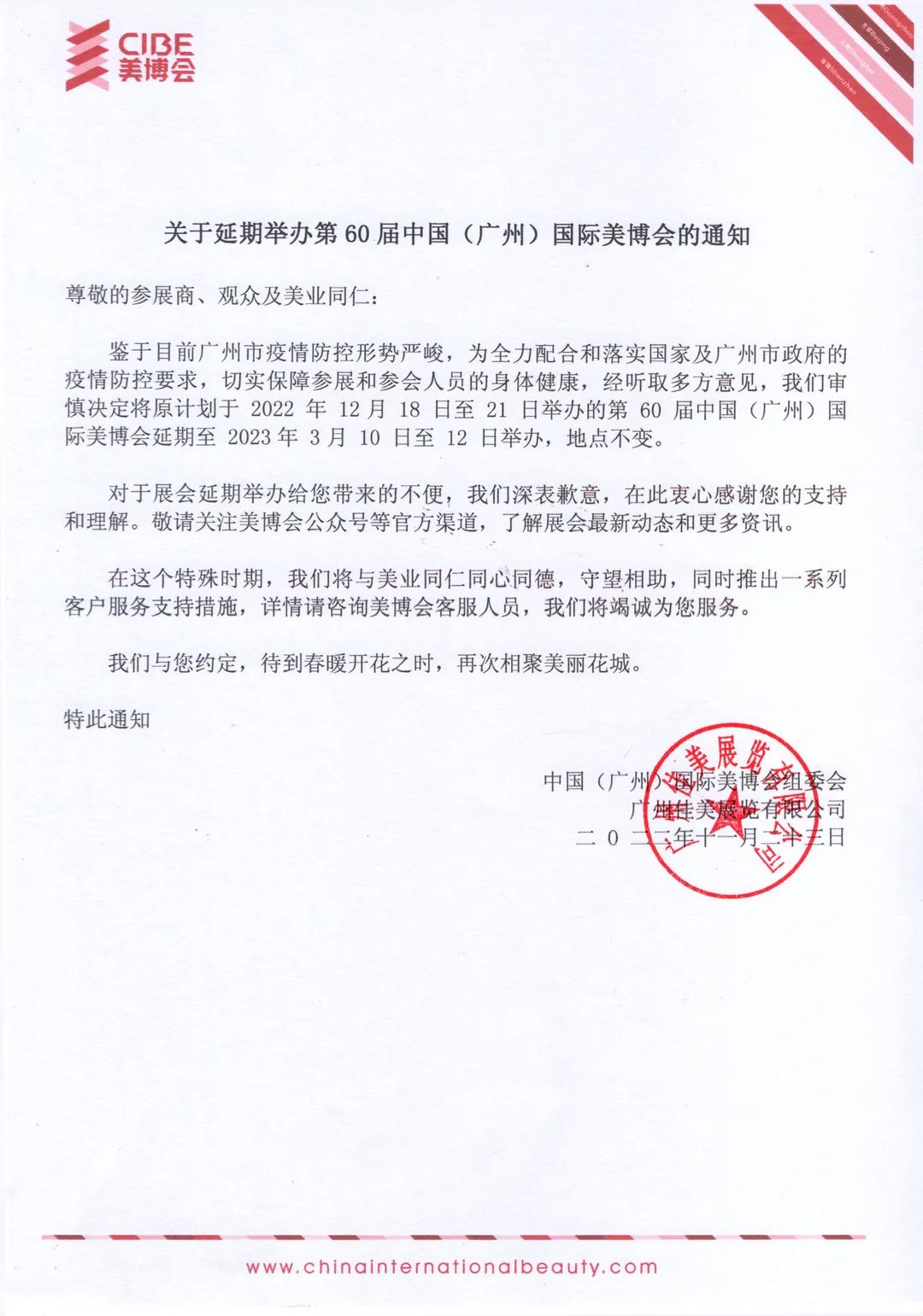 鉴于目前广州市疫情防控形势严峻,为全力配合和落实国家及广州市政府的疫情防控要求,切实保障参展和参会人员的身体健康,经听取多方意见,我们审慎决定将原计划于 2022 年 12月 18 日至 21 日举办的第 60 届中国(广州)国际美博会延期至 2023年 3月 10 日至 12 日举办,地点不变。
