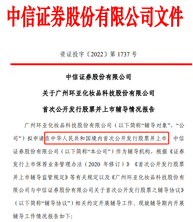 近日,中信证券公告称,公司受聘担任广州环亚化妆品科技股份有限公司(以下简称“环亚”)首次公开发行人民币普通股(A股)并上市的辅导机构。目前上市辅导工作已完成,并向中国证券监督管理委员会广东监管局报送了《辅导情况报告》。