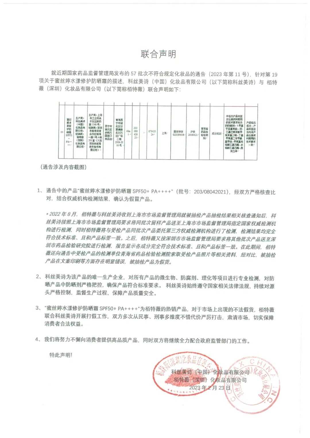 2月24日,科丝美诗在其官微发布与经销商栢特薇(深圳)化妆品有限公司联合声明,对此前被国家药监局通报的不合格产品进行回应。