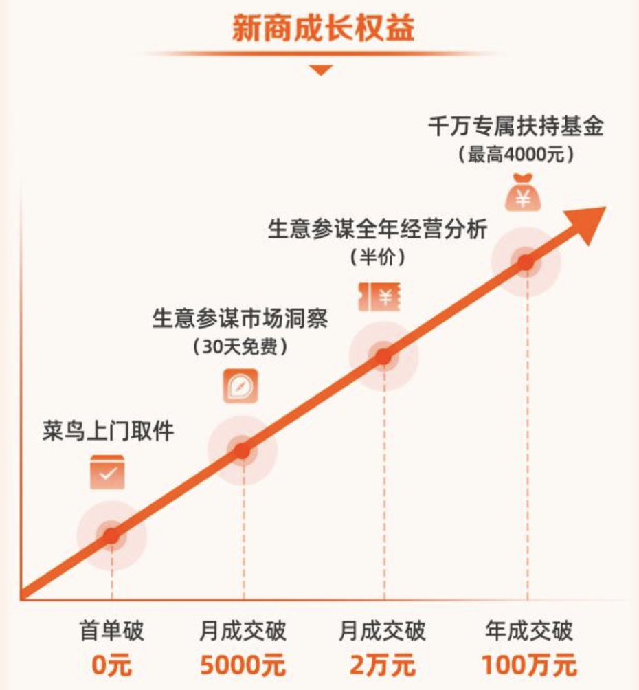目前该计划一共涵盖3个方面的激励权益,贯穿商家经营的全链路,从商家在淘宝开店成功的第一刻即可领取。