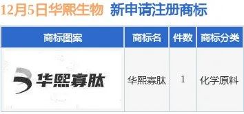 近日华熙生物科技股份有限公司新提交“华熙寡肽”商标注册申请。今年以来华熙生物科技股份有限公司新申请注册商标264件,截止目前公司共持有注册商标6779件,另有715件商标尚在注册申请中。