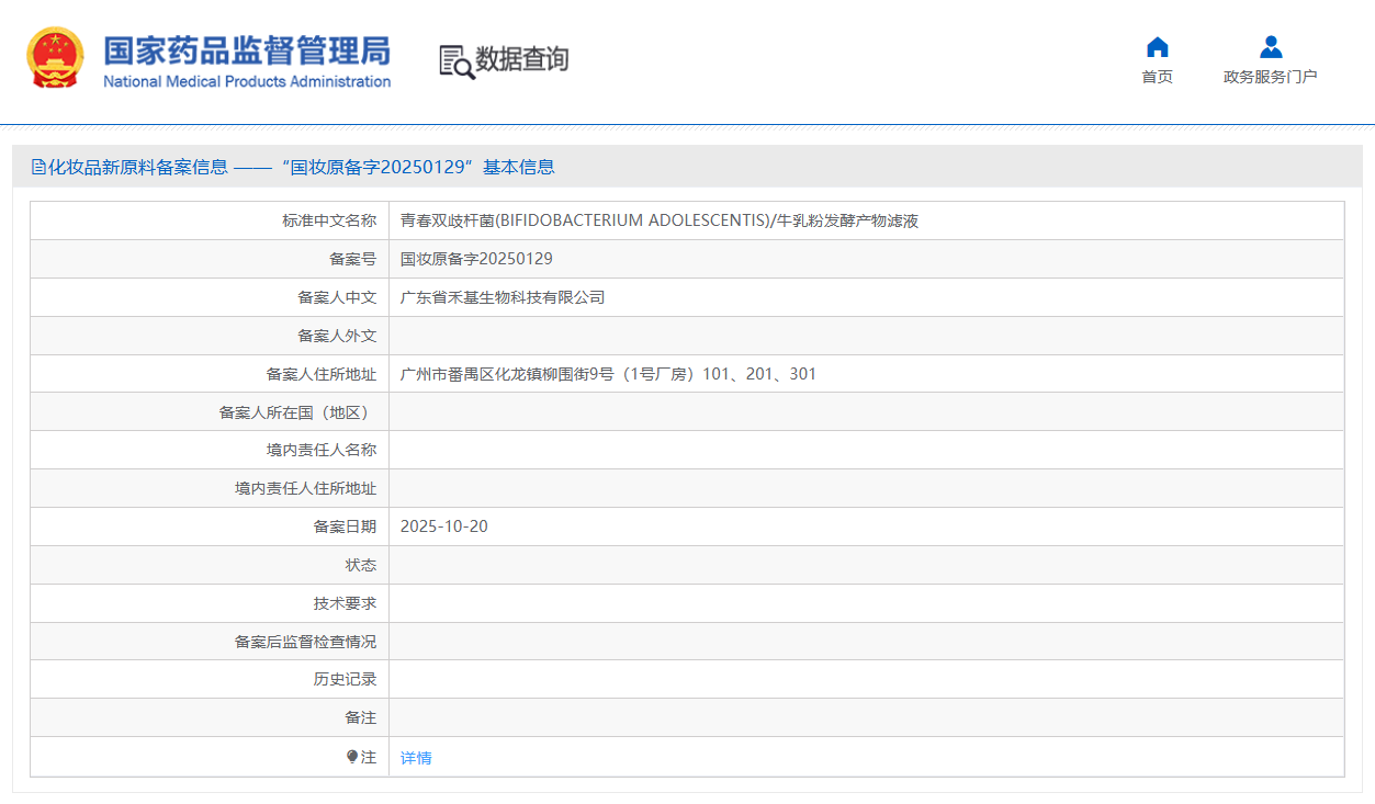 10月21日,国家药监局消息,青春双歧杆菌(BIFIDOBACTERIUM ADOLESCENTIS)/牛乳粉发酵产物滤液(备案号:国妆原备字20250129)完成化妆品新原料备案,进入公示阶段,由广东省禾基生物科技有限公司备案。目前相关技术要求尚未披露,且尚未进入监测期。该公司是花安堂旗下全资子公司。