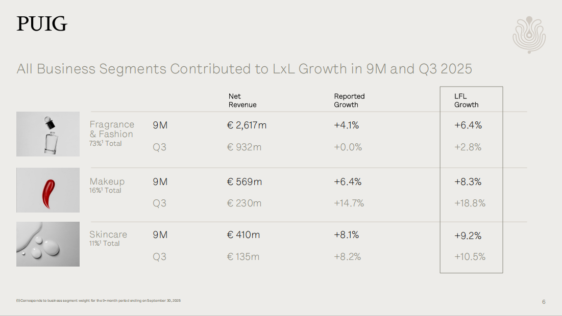 近日,西班牙香水美容和时尚集团Puig发布了截至2025年9月30日的第三季度业绩数据。内容显示,第三季度 Puig销售额达13亿欧元,按当前汇率计算同比增长3.2%;按可比数据计算增长6.1%。其中,香水与时装部门销售额有机增长2.8%;彩妆部门实现18.8%的增幅;彩妆部门实现18.8%的增幅。
