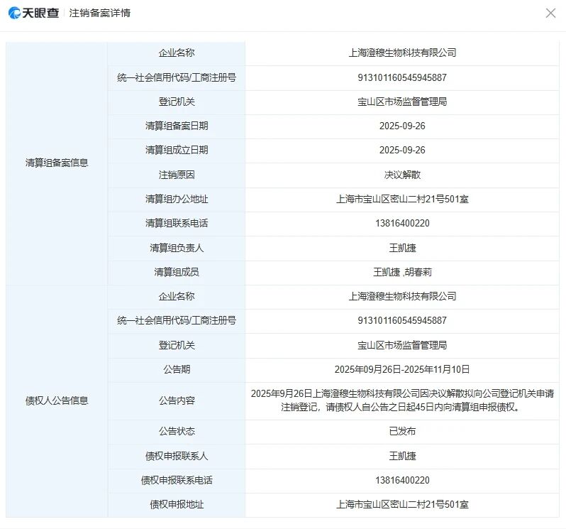据国家企业信用信息公示系统信息,知名国货美妆品牌至本母公司上海澄穆生物科技有限公司新增1条注销备案公告。根据公告,澄穆生物注销原因为“决议解散”,公告期自2025年9月26日起至11月10日止。据悉,澄穆生物成立于2012年,注册资本2000万元,是一家集研发、生产、销售、服务于一体的化妆品企业。今年9月9日,国家税务总局上海市税务局第四稽查局对澄穆生物作出行政处罚决定,因其作为扣缴义务人未履行代扣代缴个人所得税义务,被处以罚款129.93万元。彼时,澄穆生物回应媒体称,“对处罚决定存在异议,并表示已启动申诉程序。”