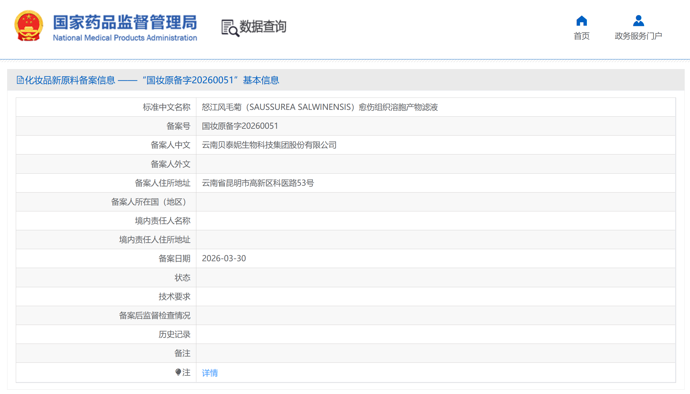 3月30日,国家药监局化妆品新原料备案平台显示,“怒江风毛菊愈伤组织溶胞产物滤液”已完成备案并进入公示期,备案号为“国妆原备字20260051”。该原料备案企业为云南贝泰妮生物科技集团股份有限公司。