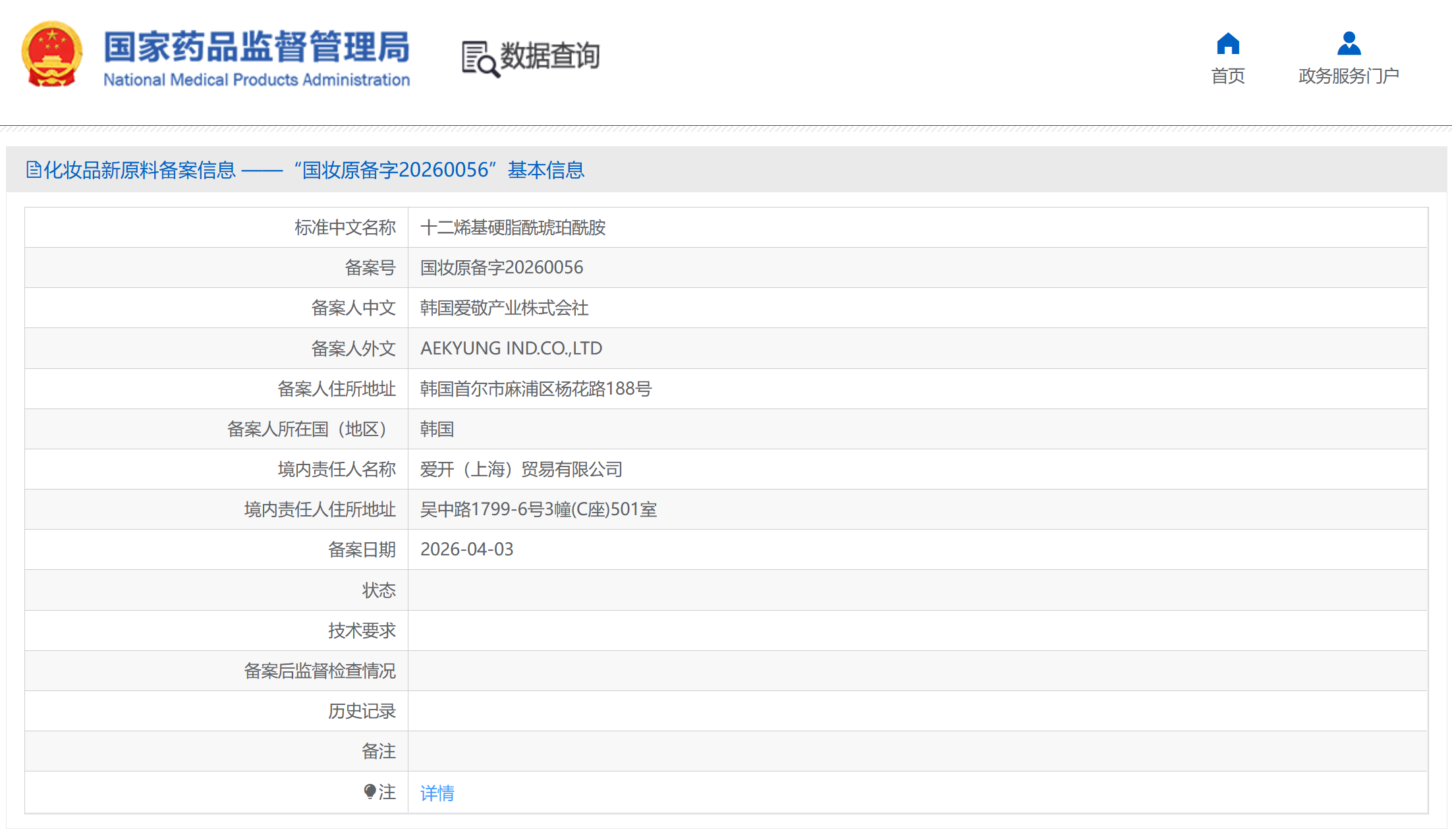 近日,据国家药品监督管理局化妆品新原料备案平台信息显示,“十二烯基硬脂酰琥珀酰胺”已完成备案并进入公示阶段,备案号为“国妆原备字20260056”。该原料的备案人为韩国爱敬产业株式会社(AEKYUNG IND.CO.,LTD)。