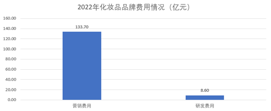 从我们选取样本数据中也可以看出,2022年8家上市化妆品品牌,花费的销售费用合计为133.70亿元,占总收入的比重为42.69%,远高于研发费用( 8.60亿元 )的占比( 2.75% )。