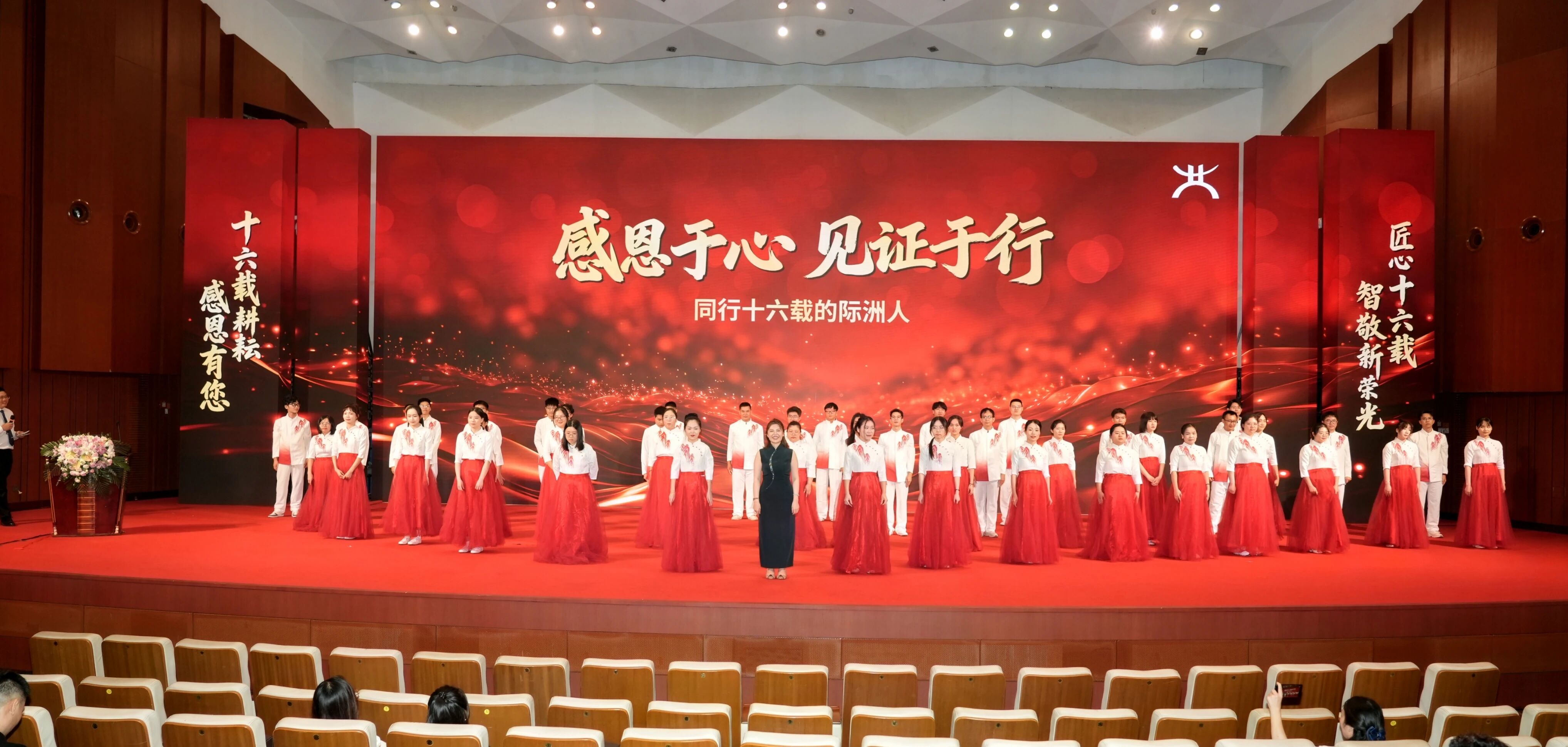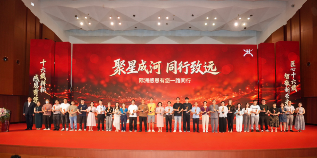 在会议现场,创始人林助凤女士带领际洲员工上台献唱了一首《感恩的心》,向所有客户表达了最诚挚的谢意,更向120位合作满5年、8年(其中不乏有10年以上)的合作客户颁发了“感恩同行 合作共赢”奖杯,以实际行动传递对长期伙伴关系的珍视。