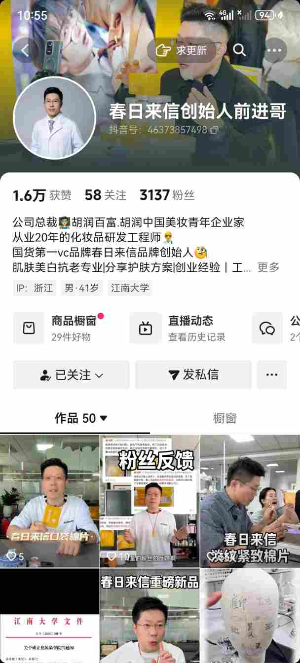 春日来信创始人卞前进也向美妆头条记者表示,除了在抖音平台,偶尔也会在小红书和视频号进行直播。对于自己来说,建立账号的主要原因之一,就是想通过社交平台向消费者传达关于护肤方面的知识。在他看来,创始人IP 对品牌而言是重要渠道,核心作用之一就是放大品牌声量,让更多消费者和合作商看到品牌内在价值。因为和冰冷的销售相比,创始人IP是一个有温度的窗口。