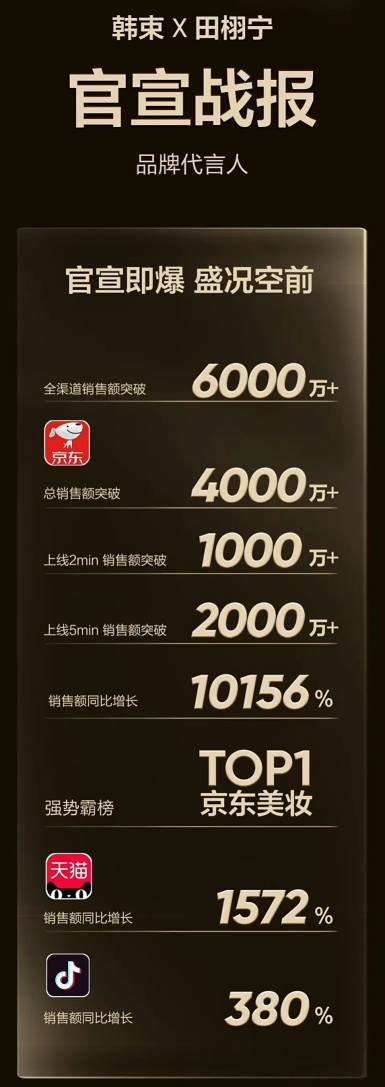 韩束官宣代言人田栩宁后,官宣仅5分钟,销售额就突破2000万,首发当日京东总销售额破4000万,登顶京东美妆TOP1,全渠道销售额一度突破6000万;溪木源与蔡徐坤合作的限定礼盒,4 小时内即告售罄……