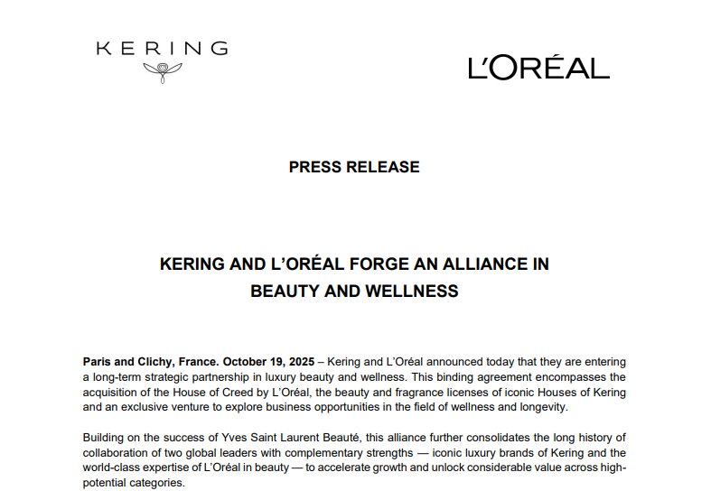 公告显示,本次交易包括三项核心内容:欧莱雅集团收购Creed品牌(House of Creed)、获得开云集团旗下多个标志性品牌的美容及香水业务授权,以及双方成立专属合资企业。