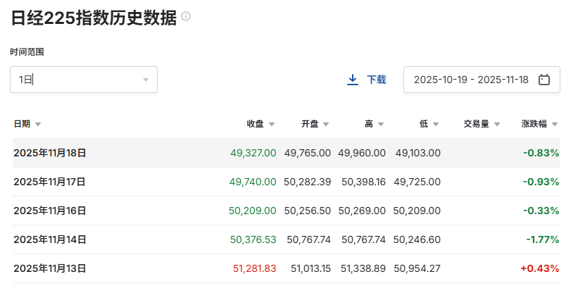 非常依赖中国游客的日本资本市场对此反应迅速而激烈。11月17日,日经225指数开盘即“跳水”,一度跌超1%跌破50000点。11月18日,日本消费股继续下跌,但下跌趋势有所缓和,资生堂跌超2%,高丝跌0.69%,POLA维稳,花王涨0.38%。