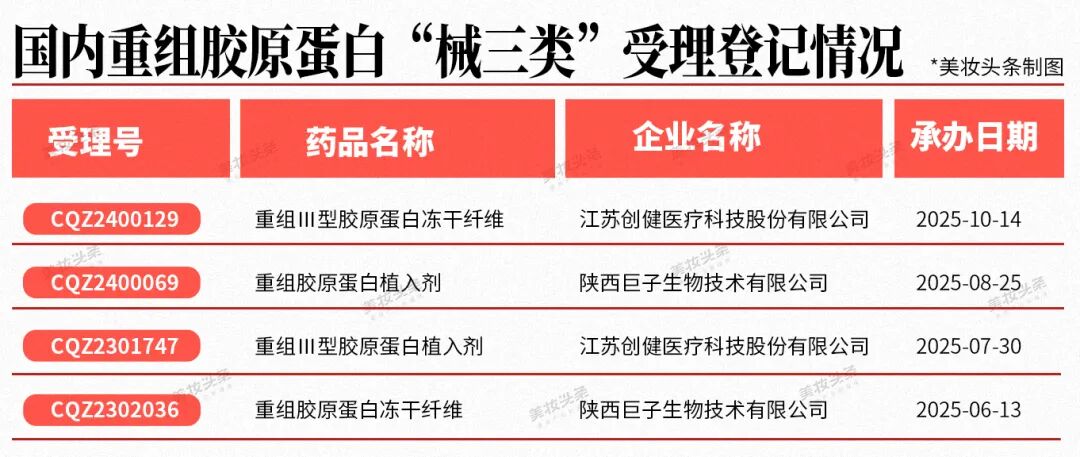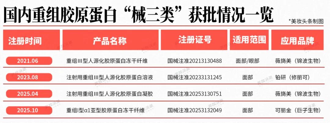 2025年10月,巨子生物的重组I型α1亚型胶原蛋白冻干纤维获批“械三证”,成为国内第四张重组胶原蛋白第三类医疗器械注册证。
