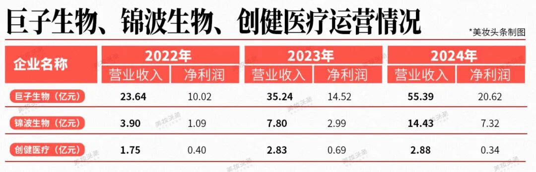 若创健医疗自主研发的重组胶原蛋白产品能够顺利获得第五张“械三证”,将不仅填补其在Ⅲ类医疗器械领域的资质空白,更可通过“械字号+妆字号”双轮驱动模式,显著提升公司在重组胶原蛋白领域的全产业链竞争力。与巨子生物、锦波生物相比,目前创健医疗无论是营业收入,还是净利润都是“弱小”的。