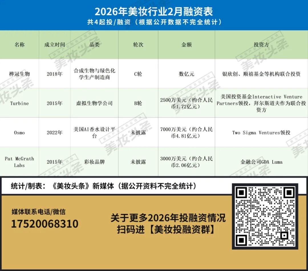 美妆头条不完全统计,2月全球美妆及关联产业已公开落地投融资事件共4起,全部为亿元及以上级别,总融资金额折合人民币超10亿元,覆盖原料、AI技术、彩妆三大细分领域。