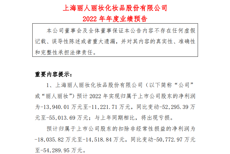 1月30日晚间,丽人丽妆发布2022年业绩预告。预计2022年实现归属于上市公司股东的净利润为约-1.39亿元至约-1.12亿元,同比变动约-5.23亿元至约-5.5亿元;与上年同期相比,将出现亏损。