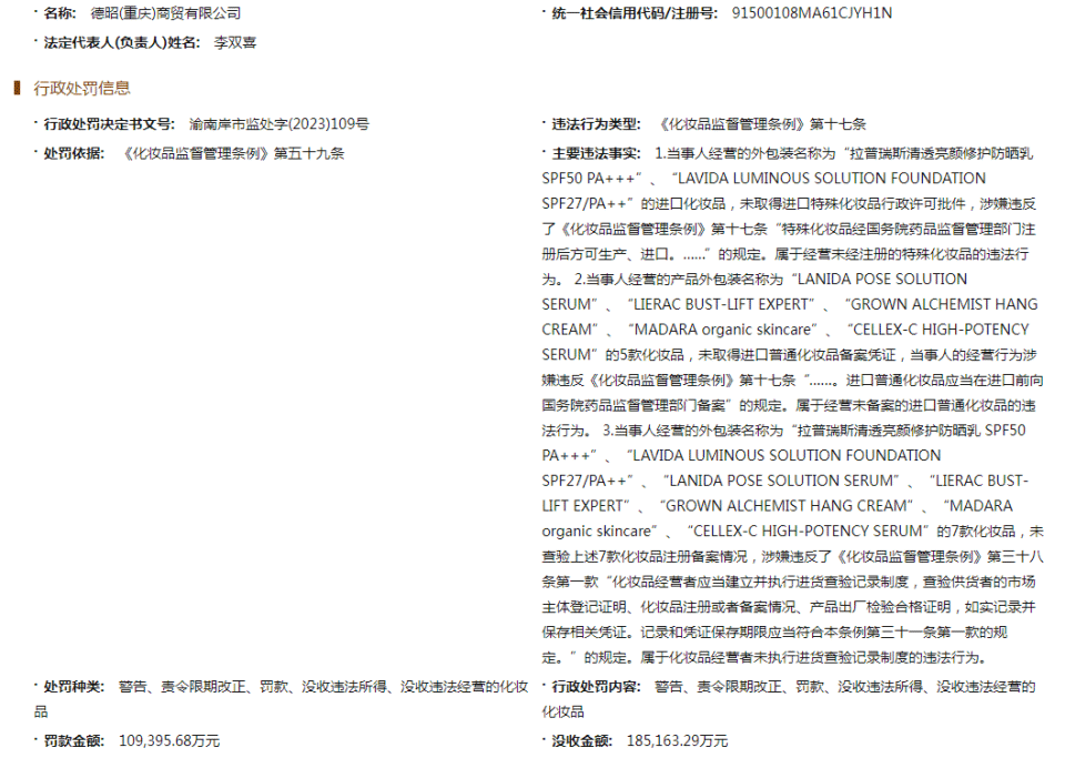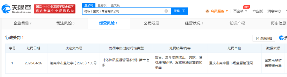 近日,记者从天眼查App获悉,德昭(重庆)商贸有限公司因违反化妆品监督管理条例,被重庆市南岸区市场监督管理局罚款10.93万余元、没收违法所得18.5万余元。