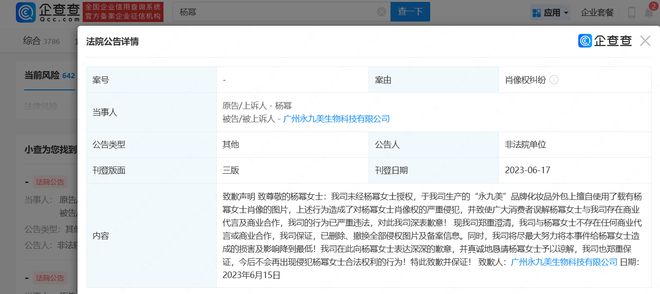 企查查APP显示,近日,广州永九美生物科技有限公司、广东丝蕊社化妆品有限公司、广州芮姿生物科技有限公司、广州千洁度化妆品有限公司因侵权发布声明,向杨幂公开致歉。