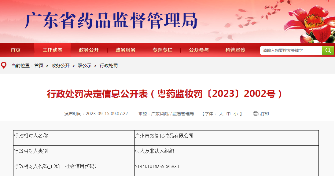 9月15日,广东省药品监督管理局发布一则对广州市敦复化妆品有限公司的行政处罚书,经查明,敦复公司涉嫌生产经营未经注册的特殊化妆品,违反了《化妆品监督管理条例》第十七条,且主观故意明显。