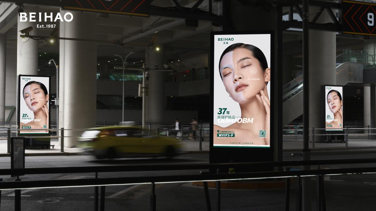 值得关注的是,美业盛会上海CBE举办前后,贝豪在上海虹桥机场、高铁站等交通枢纽投放82面广告大屏,高能曝光,精准覆盖客户和消费群体,强化其高端护肤ODM/OBM心智。
