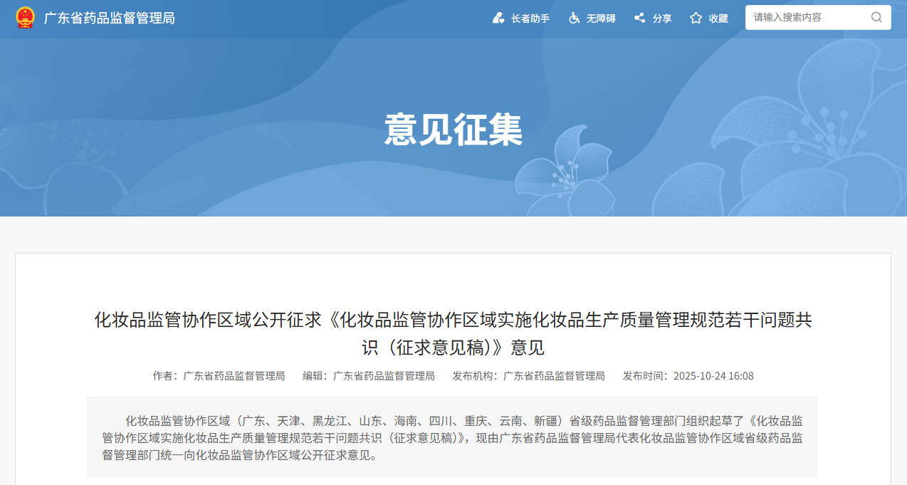 10月27日,化妆品监管协作区域(广东、天津、黑龙江、山东、海南、四川、重庆、云南、新疆)省级药品监督管理部门组织起草了《化妆品监管协作区域实施化妆品生产质量管理规范若干问题共识(征求意见稿)》,现由广东省药品监督管理局代表化妆品监管协作区域省级药品监督管理部门统一向化妆品监管协作区域公开征求意见。时间截至11月13日。