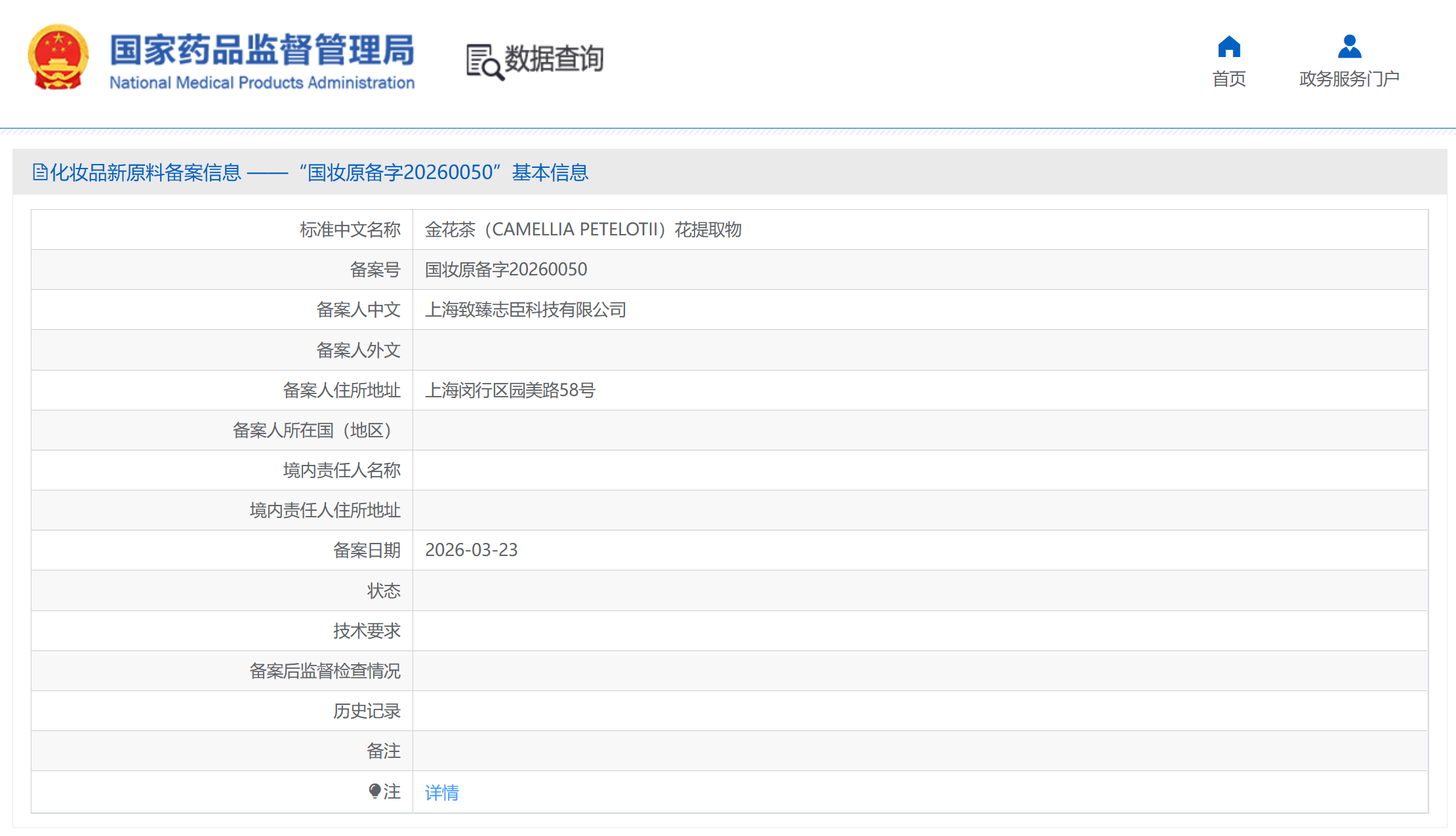 本次备案主体上海致臻志臣科技有限公司是上海臻臣化妆品有限公司的全资原料研发子公司,专注于中国特色植物资源的功效挖掘与转化应用。此次金花茶花提取物的成功备案,是其继黑涩楠果汁原料(国妆原备字20260044)之后备案的第二款新原料,标志着国内企业在珍稀植物护肤成分开发领域取得新进展。该成分的入局,也为当前聚焦植物活性物的中国化妆品原料创新提供了新的方向与可能性。