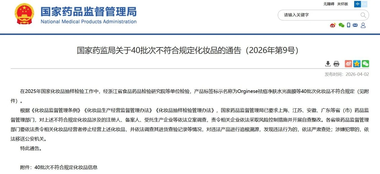 2026年4月2日,国家药品监督管理局官网发布《关于40批次不符合规定化妆品的通告(2026年第9号)》,通报在2025年国家化妆品抽样检验中,发现40批次产品不符合规定 。通告显示,不合格产品涉及面膜、防晒乳、牙膏、洗发水、染发膏等多个品类 其中,防晒类产品问题尤为突出,共有16批次上榜,占比高达40% 。