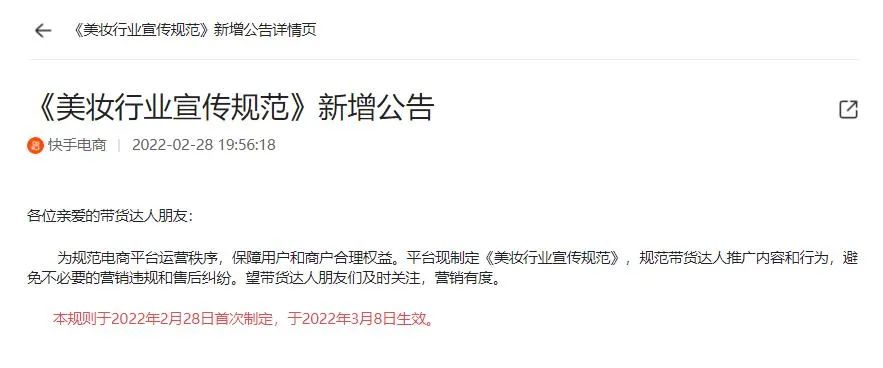 2月28日晚间,快手电商发布《美妆行业宣传规范》(下称《规范》),共列出15条宣传内容和行为要求,对快手小店带货达人推广美妆类商品作出了明确规定。