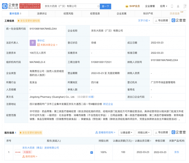 企查查APP显示,3月23日,京东大药房(广汉)有限公司成立,法定代表人为李叶红,注册资本100万元人民币,经营范围包含:化妆品零售;消毒剂销售(不含危险化学品);日用品销售;第一类医疗器械销售等。企查查股权穿透显示,该公司由京东大药房(青岛)连锁有限公司100%控股。