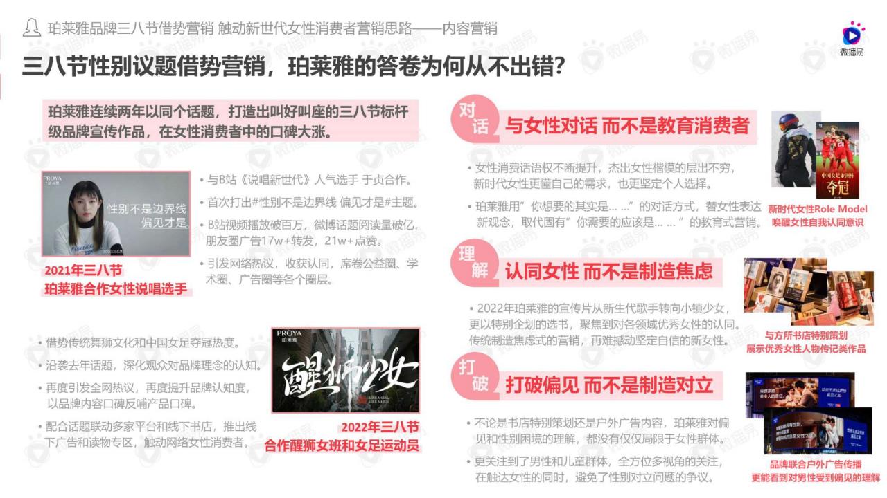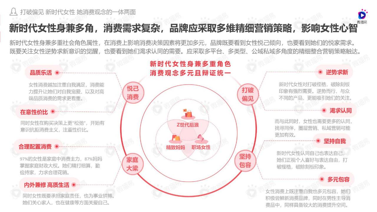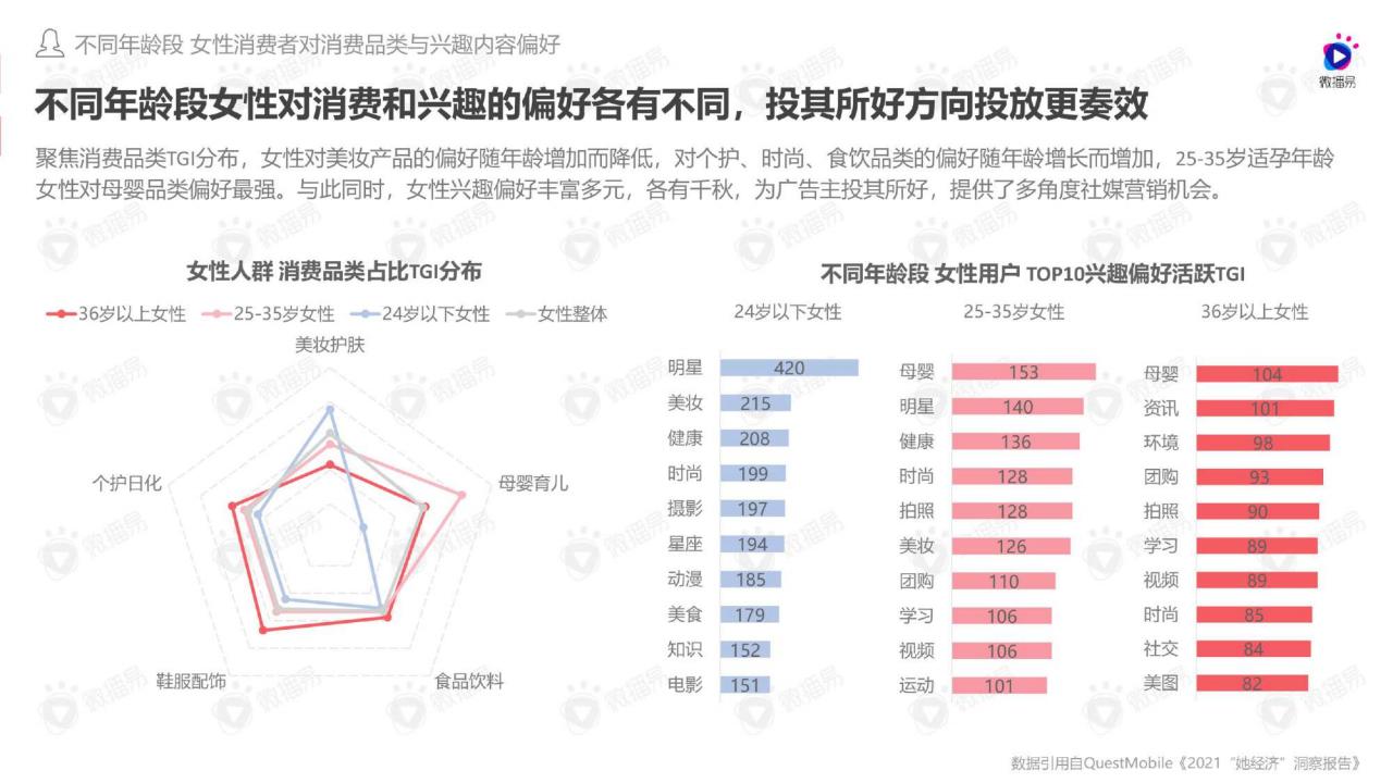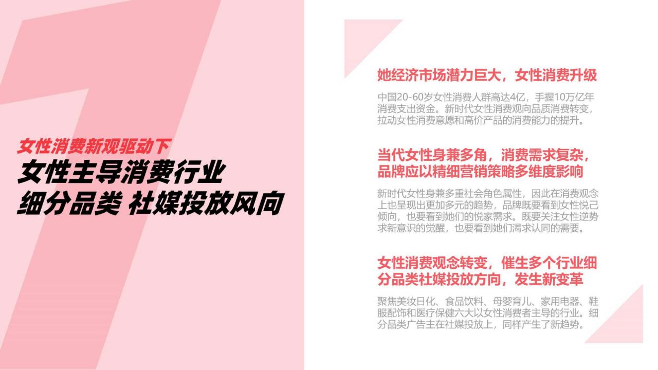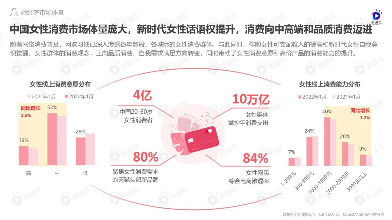 中国女性消费市场体量庞大,新时代女性话语权提升,消费向中高端和品质消费迈进随着网络消费普及,网购习惯已深入渗透各年龄段、各城际的女性消费群体。与此同时,伴随女性可支配收入的提高和新时代女性自我意识觉醒,女性群体的消费观念,正向品质消费、自我需求满足方向转变,同时带动了女性消费意愿和高价产品的消费能力的提升。