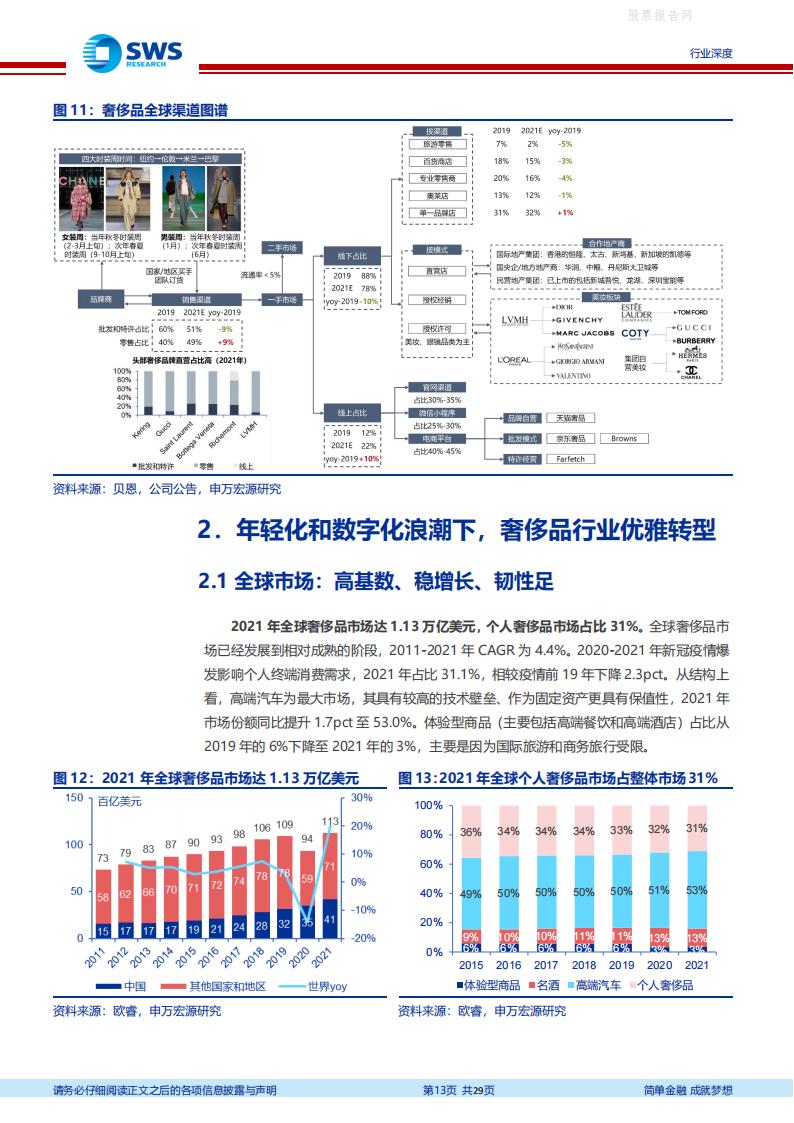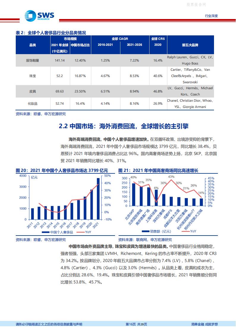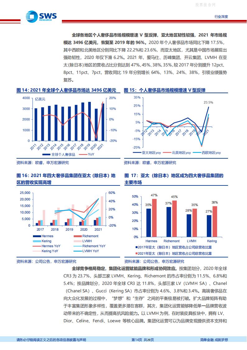 全球奢侈品市场高基数、稳增长、韧性足,亚太市场成为增长主引擎,中国市场逆势增长。2021 年全球奢侈品市场达1.13 万亿美元,个人奢侈品市场占比31%。亚太地区引领全球个人奢侈品市场“V 型”复苏,2021 年市场规模达3496 亿美元,恢复至2019 年的96%。